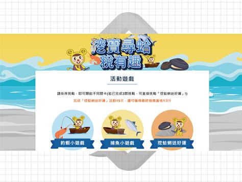 搭配關卡類型釣蝦、捕魚、尋蛤小遊戲,讓捐發票兌換宣導品更增加趣味 , 遊戲中置入相關的在地特色介紹以及稅務宣導知識 , 讓活動有當地特色有有宣導意義..